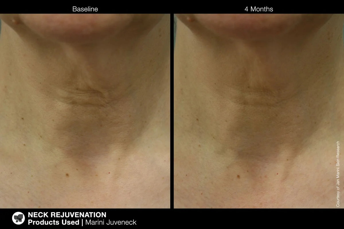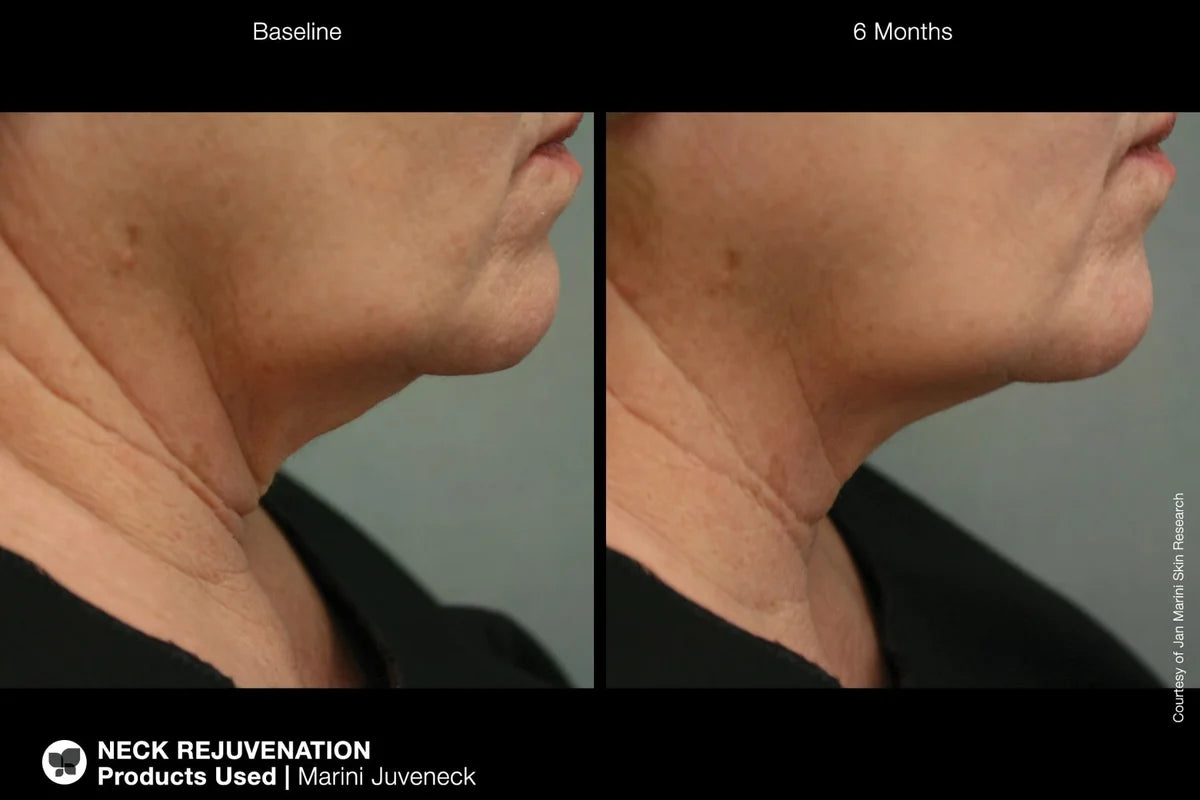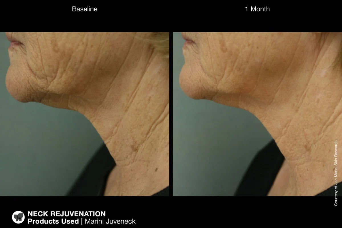 In a study published in the Journal of Drugs & Dermatology, Marini Juveneck was shown to significantly improve satisfaction with hydration, texture, wrinkles and laxity with extremely high satisfaction and 94% of subjects noting improvement in one or more categories.
